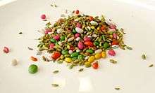 Many cultures in India and neighboring countries (where it is known as saunf in Hindi), Afghanistan, Iran, and the Middle East use fennel seed in cooking as one of the most important spices in Kashmiri Pandit and Gujarati cooking.[21] It is an essential ingredient of the Assamese/Bengali/Oriya spice mixture panch phoron[22] and in Chinese five-spice powders. In many parts of India and Pakistan, roasted fennel seeds are consumed as mukhwas, an after-meal digestive and breath freshener, or candied as comfit.