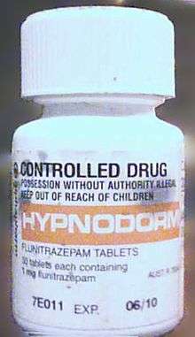 Flunitrazepam, also known as Rohypnol among others,[1] is an intermediate acting benzodiazepine used in some countries to treat severe insomnia and in fewer, early in anesthesia.[2] Just as with other hypnotics, flunitrazepam should be strictly used only on a short-term basis or in those with chronic insomnia on an occasional basis.[2] Flunitrazepam has been referred to as a date rape drug even though its incidence is very rare in cases that have been reported.[3]