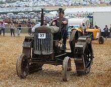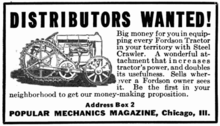Like Model T cars and trucks, the Fordson tractor provided the basis for a large and varied aftermarket in accessories and conversions. A pair of articles[42][43] in a 1922 issue of the Chilton Tractor Journal describes the business environment[42] and gives photographs of many of the attachments and conversions available.[43] As with most other tractors, farmers and construction contractors could buy aftermarket governors, ignition parts, hitches and drawbars; but with the Fordson especially, one could buy a crawler tractor, road grader, or self-propelled combine built by an aftermarket firm that used the Fordson essentially as a platform. For example, the original Gleaner self-propelled combines were built by attaching the combine to a Fordson. At least 3 companies offered crawler conversions, and others offered enlarged cleats, including the "overgrown tire chain" type that had led to crawler development not long before. Several companies converted Fordsons to road graders; the Wehr[44] (video) is well remembered. The first tricycle cultivator version of the Fordson was available as an aftermarket conversion by the Moline Implement Company as early as 1920 or 1921,[45] which was 3 to 4 years before the Farmall was introduced, a full decade before Dearborn prototyped the Fordson All-Around,[37] and a full decade and a half before Ford Ltd produced that model.[37] It lacked those tractors' high clearance but was otherwise prescient.