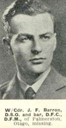 James 'Fraser' Barron DSO & Bar, DFC, DFM (9 January 1921 – 20 May 1944), was an officer of the Royal New Zealand Air Force (RNZAF) who was killed in flying operations during the Second World War.[1][2] Barron was one of only four New Zealanders to be awarded a bar to his DSO and was considered a standout bomber pilot of the war.