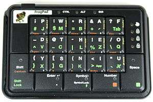 FrogPad is a small chorded keyboard about the size of a numeric keypad that can be used with one hand. It was produced by Frogpad Inc.