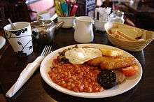 In England it is usually referred to as a 'full English breakfast' (often shortened to 'full English') or 'fry-up'.[2][3] Other regional names and variants include the 'full Scottish', 'full Welsh', 'full Irish' and the 'Ulster fry'.[4][5][6]