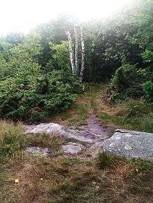 The fort is located on a hill almost in the centre of the island, part of the Almindingen forest.[5][6] It is several hundred yards off the main road from Rønne to Svaneke.[1] The site is naturally protected by cliffs, especially on the south side, which are up to 20 metres (66 ft) in height.[7] A water pool, located on the northwestern side was the main water supply to the fortress.[2] The ruins are situated in mounds.[8]