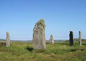 Garynahine is the location of some outliers of the Callanish stones ('Ceann Hulavig'), an elliptical ring of five standing stones, 13.3 m x 9.5 m in diameter.