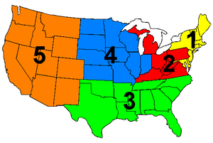 On August 30, 1928, the Commission issued General Order 40, which set new standards for radio broadcasting. A "broadcast band" was defined, consisting of 96 frequencies, spaced every 10 kilocycles from 550 to 1500 kc. Six frequencies — 690, 730, 840, 910, 960, and 1030 — were restricted for use only by Canadian stations, leaving 90 available for U.S. assignments. The country was further divided into five zones, in order to coordinate the Davis Amendment directive of an equitable assignment of stations.[2]