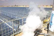 GlassPoint’s enclosed trough technology encloses lightweight mirrors in a standard agricultural greenhouse, concentrating the sun’s energy to heat water and create steam. The steam is then injected in an oil reservoir to aid the extraction of heavy crude.[1] The company’s solar thermal technology uses trough-shaped mirrors, standard piping and a glasshouse structure.[2] By using the enclosed trough architecture, GlassPoint claims it can produce emission-free steam for two to three times less than competing concentrated solar power technologies, such as the power tower and linear fresnel.[3] The company is based in Fremont, California, with offices in Bakersfield, California, Muscat, Oman, Kuwait City, Kuwait and Shenzhen, China.