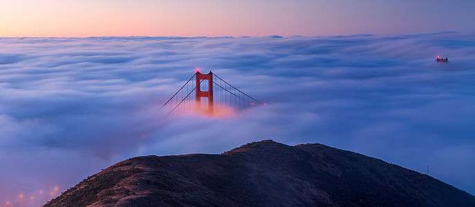 A view of the Golden Gate Bridge from the Marin Headlands on a foggy morning at sunrise- View of the northern tower of the bridge
