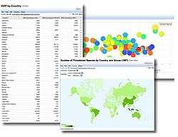 The web service provides means for visualizing data with pie charts, bar charts, lineplots, scatterplots, timelines, and geographical maps. Data are exported in a comma-separated values file format.