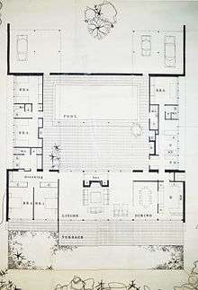 The modernist approach that the Bell Clerehan Partnership adopted for the design of the Simon House, is very prototypical of Bell's architectural style. Being a countryman, the relationship between the land and architecture was very significant to Bell. This is why "an integrated sequence of interior and exterior spaces",[2] was affiliated to combine the living quarters around a centred terrace and swimming pool. Glazed panels wrap the living and dining room spaces, to fully appreciate the views of the Mornington Peninsula. Symmetry is abundant throughout the single-storey floor plan and program is mirrored in an even trend throughout. This project won the "Victorian Architectural Medal" in 1963–64.[3]