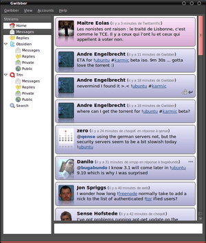 Gwibber /ˈɡwɪbər/ is a microblogging client for the GNOME desktop environment. It brings the most popular social networking services like Facebook, Twitter, etc. into a single window and gives ability to control communication through one single application. It was created by Ryan Paul, a writer for Ars Technica.