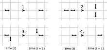In this step the above rules, 2., 3. and 4. are checked and applied if any collisions have occurred. This results in head-on collision particles changing direction, pass-through collisions continuing unchanged, or non-colliding particles simple remaining the same.
