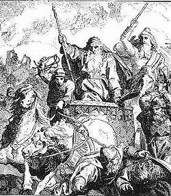 Blind, old King Harald rode out into the fray with a sword in each hand and struck away at the enemy. Harald fell in the battle, some say by Odin's own hand, along with 15 kings and 30,000 free-born men. When Sigurd Ring heard that his opponent had fallen, he instantly gave the sign that the fighting should cease. The day after the battle he sought out King Harald's body and put it onto a funeral pyre along with his horse. Sigurd Ring stood before the fire and bade Harald ride straight to Valhalla and secure lodging for those who had perished. Thereafter all the chiefs walked around the pyre throwing weapons and gold onto it. Harald Hildtand fell the same day as his son, Rørek in a fight with Sigurd Ring himself about the year 770 or 772.[4]
