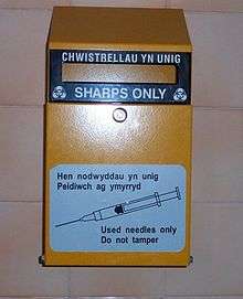 A bin allowing for safe disposal of needles in a public toilet in Caernarfon, Wales.