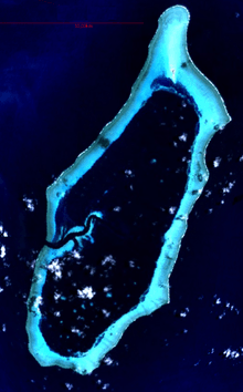 Helen or Helens Reef (Hotsarihie), about 70 km east of Tobi Island, is a largely submerged atoll, with just one islet (Helen Island). The atoll is 25 km long and nearly 10 km wide, with a lagoon area of 103 km² and a total area including reef flat of 163 km². A channel leads into the lagoon from near the middle of the western side of the reef. Immediately south of the channel is Round Rock, which dries. The lagoon has about 85 patch and pinnacle Reefs.