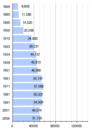 In 1869, the current area of the Hietzing District included only 9,808 inhabitants. Due to the low population density at that time, Hietzing was one of the few districts which had a persistent population growth. Before the start of the First World War, the population in 1910, with 34,883 inhabitants, had more than tripled, but then the growth slowed down. In 1971, the district reached 57,068 people, the highest population to date. Then the population stagnated, falling 4% during the next 2 decades, and later dropping another 10% in the 1990s, but rose gradually after the millennium year. From 2001, the population in Vienna city-wide trended to grow, including in Hietzing. At the beginning of 2007, the population stood at 51,120 people.