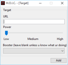 The HOIC was developed during the conclusion of Operation Payback by the hacktivist collective Anonymous.[3] As Operation Payback concluded there was massive pressure on the group from law enforcement agencies, which captured and prosecuted more than 13 individuals connected with the group.[4][5] This forced many members of the group to rethink their strategies and subsequently this part of the group launched Operation Leakspin.[6] However a large part of Anonymous remained focused on launching opt-in DDoS attacks. However the Low Orbit Ion Cannon was not powerful enough to launch attacks with such a limited number of users. Therefore, the HOIC was designed to remedy this with the ability to cause HTTP Flood with low number of user agents with as few as 50 users being required to successfully launch an attack, and co-ordination between multiple users leading to an exponential increase in the damage.[7][8] The HOIC was the first tool of its kind to have support for the so-called "booster files", configurable VBscript modules that randomize the HTTP headers of attacking computers, allowing thousands upon thousands of highly randomized combinations for user agents.[9] Apart from allowing user agents to implement some form of randomization countermeasures the booster files can and have been used to increase the magnitude of the attack.[10]