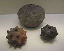 The first concerted Mongol invasion of Jin occurred in 1211 and total conquest was not accomplished until 1234. In 1232 the Mongols besieged the Jin capital of Kaifeng and deployed gunpowder weapons along with other more conventional siege techniques such as building stockades, watchtowers, trenches, guardhouses, and forcing Chinese captives to haul supplies and fill moats.[31] Jin scholar Liu Qi (劉祈) recounts in his memoir, "the attack against the city walls grew increasingly intense, and bombs rained down as [the enemy] advanced."[31] The Jin defenders also deployed gunpowder bombs as well as fire arrows (huo jian 火箭) launched using a type of early solid-propellant rocket.[14] Of the bombs, Liu Qi writes, "From within the walls the defenders responded with a gunpowder bomb called the heaven-shaking-thunder bomb (震天雷). Whenever the [Mongol] troops encountered one, several men at a time would be turned into ashes."[31] A more fact based and clear description of the bomb exists in the History of Jin: "The heaven-shaking-thunder bomb is an iron vessel filled with gunpowder. When lighted with fire and shot off, it goes off like a crash of thunder that can be heard for a hundred li [thirty miles], burning an expanse of land more than half a mu [所爇圍半畝之上, a mu is a sixth of an acre], and the fire can even penetrate iron armor."[31] A Ming official named He Mengchuan would encounter an old cache of these bombs three centuries later in the Xi'an area: "When I went on official business to Shaanxi Province, I saw on top of Xi'an's city walls an old stockpile of iron bombs. They were called 'heaven-shaking-thunder' bombs, and they were like an enclosed rice bowl with a hole at the top, just big enough to put your finger in. The troops said they hadn't been used for a very long time."[31] Furthermore, he wrote, "When the powder goes off, the bomb rips open, and the iron pieces fly in all directions. That is how it is able to kill people and horses from far away."[32]