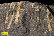 The first evidence of burrowing which is widely accepted dates to the Ediacaran (Vendian) period, around 560 million years ago. During this period the traces and burrows basically are horizontal on or just below the seafloor surface. Such traces must have been made by motile organisms with heads, which would probably have been bilateran animals.[12] The trace observed imply simple behaviour, and point to organisms feeding above the surface and burrowing for protection from predators.[13] Contrary to widely circulated opinion that Ediacaran burrows are only horizontal the vertical burrows Skolithos are also known.[14] The producers of burrows Skolithos declinatus from the Vendian (Ediacaran) beds in Russia with date 555.3 million years ago have not been identified; they might have been filter feeders subsisting on the nutrients from the suspension. The density of these burrows is up to 245 burrows/dm2.[15] Some Ediacaran trace fossils have been found directly associated with body fossils. Yorgia and Dickinsonia are often found at the end of long pathways of trace fossils matching their shape.[16] The feeding was performed in a mechanical way, supposedly the ventral side of body these organisms was covered with cilia.[17] The potential mollusc related Kimberella is associated with scratch marks, perhaps formed by a radula,[18] further traces from 555 million years ago appear to imply active crawling or burrowing activity.[19]