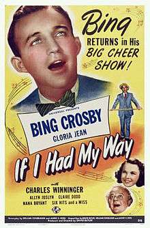 If I Had My Way is a 1940 musical comedy film directed by David Butler and starring Bing Crosby and Gloria Jean.[1] Based on a story by David Butler, the film is about a construction worker who takes charge of the daughter of a fellow worker killed in an accident. After bringing the girl to New York to find her uncle, who has spent his life savings on a failed restaurant, he tries to help the girl and her uncle make the restaurant a success.