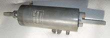 An ignitron is usually a large steel container with a pool of mercury in the bottom that acts as a cathode during operation. A large graphite or refractory metal cylinder, held above the pool by an insulated electrical connection, serves as the anode. An igniting electrode (called the ignitor), made of a refractory semiconductor material such as silicon carbide,[1] is briefly pulsed with a high current to create a puff of electrically conductive mercury plasma. The plasma rapidly bridges the space between the mercury pool and the anode, permitting heavy conduction between the main electrodes. At the surface of the mercury, heating by the resulting arc liberates large numbers of electrons which help to maintain the mercury arc. The mercury surface thus serves as the cathode, and current is normally only in one direction. Once ignited, an ignitron will continue to pass current until either the current is externally interrupted or the voltage applied between cathode and anode is reversed.[2]