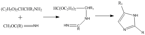 - The (1,5) or (3,4) bond can be formed by the reaction of an imidate and an α-aminoaldehyde or α-aminoacetal, resulting in the cyclization of an amidine to imidazole. The example below applies to imidazole when R = R1 = hydrogen.