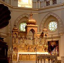 The brilliant altar was handmade in Lyons, France, and is 24 karat gold-plated. The central focal point of the church is "Mary's Niche", a solid-marble statue of the Blessed Virgin standing in front of a gilded, lit background. At the same level are found four other statues of saints.