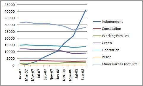 The Independent Party of Oregon is one of the largest minor political parties in the United States. From its inception in January 2007 through September 2011, the party added more than 90,000 members, making it the third largest political party in Oregon. As the first chart illustrates, its members account for approximately 40 percent of the net growth in the Oregon electorate from January, 2007 to December, 2010. It is also larger than all other Oregon minor political parties combined, as illustrated in the second chart.[3]