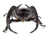 Chewing insects have two mandibles, one on each side of the head. The mandibles are positioned between the labrum and maxillae. The mandibles cut and crush food, and may be used for defense; generally, they have an apical cutting edge, and the more basal molar area grinds the food. They can be extremely hard (around 3 on Mohs, or an indentation hardness of about 30 kg/mm2); thus, many termites and beetles have no physical difficulty in boring through foils made from such common metals as copper, lead, tin, and zinc.[1]:22–24 The cutting edges are typically strengthened by the addition of zinc, manganese, or rarely, iron, in amounts up to about 4% of the dry weight.[25] They are typically the largest mouthparts of chewing insects, being used to masticate (cut, tear, crush, chew) food items. They open outwards (to the sides of the head) and come together medially. In carnivorous, chewing insects, the mandibles can be modified to be more knife-like, whereas in herbivorous chewing insects, they are more typically broad and flat on their opposing faces (e.g., caterpillars). In male stag beetles, the mandibles are modified to such an extent as to not serve any feeding function, but are instead are used to defend mating sites from other males. In ants, the mandibles also serve a defensive function (particularly in soldier castes). In bull ants, the mandibles are elongated and toothed, used as hunting (and defensive) appendages.