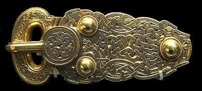 Interlace is a key feature of the "Style II" animal style decoration of Migration Period art, and is found widely across Northern Europe, and was carried by the Lombards into Northern Italy. Typically the long "ribbons" eventually terminate in an animal's head. By about 700 it becomes less common in most of Europe, but continues to develop in the British Isles and Scandinavia, where it is found on metalwork, woodcarving, runestones, high crosses, and illuminated manuscripts of the 7th to 12th centuries. Artist George Bain has characterised the early Insular knotwork found in the 7th-century Book of Durrow and the Durham Cathedral Gospel Book fragment as "broken and rejoined" braids.[2] Whether Coptic braid patterns were transmitted directly to Hiberno-Scottish monasteries from the eastern Mediterranean or came via Lombardic Italy is uncertain.[1] Art historian James Johnson Sweeney argued for direct communication between the scriptoria of Early Christian Ireland and the Coptic monasteries of Egypt.[3]