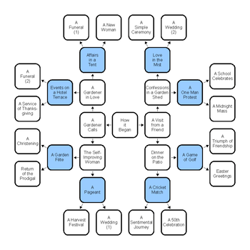 The idea was to write a multi-ended play in which choices lead to other choices in an increasing proliferation. Ayckbourn started writing in early 1982 with the intention of performing all of the plays over the summer months of that year. It proved to be a far greater challenge than he expected and only three of the possible variations actually opened that summer, starting with the variation called "A Cricket Match". The remaining plays came together during Autumn and Winter, finishing in February 1983 with "A Pageant".