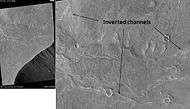 Inverted relief, inverted topography, or topographic inversion refers to landscape features that have reversed their elevation relative to other features. It most often occurs when low areas of a landscape become filled with lava or sediment that hardens into material that is more resistant to erosion than the material that surrounds it. Differential erosion then removes the less resistant surrounding material, leaving behind the younger resistant material which may then appear as a ridge where previously there was a valley. Terms such as "inverted valley" or "inverted channel" are used to describe such features.[1] Inverted relief has been observed on the surfaces of other planets as well as on Earth. For example, well-documented examples of inverted topography have been discovered on Mars.[2]