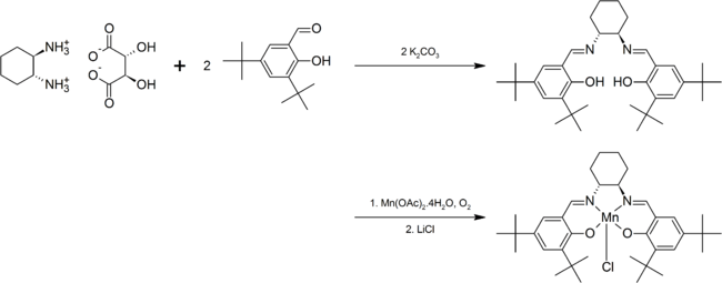 - ↑ Larrow, JF; Jacobsen, EN (1998). "(R,R)-N,N'-Bis(3,5-Di-tert-Butylsalicylidene)-1,2-Cyclohexanediamino Manganese(III) Chloride, A Highly Enantioselective Epoxidation Catalyst". Org. Synth. 75: 1.