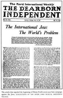 Henry Ford was a non-interventionist who opposed World War I, and he believed that Jews were responsible for starting wars in order to profit from them: "International financiers are behind all war. They are what is called the international Jew: German Jews, French Jews, English Jews, American Jews. I believe that in all those countries except our own the Jewish financier is supreme . . . here the Jew is a threat".[108] Ford also shared Marx's view that Jews were responsible for capitalism, and in their role as financiers, they did not contribute anything of value to society.[109]