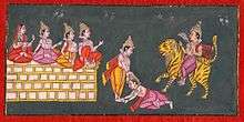 Devotion to Guru occupies an important place throughout the commentary. Many of its chapters begin with an invocation to his Guru Nivruttinath, who is eulogised by Dnyaneshwar as the person who helped him "cross the ocean of existence".[71] The discussion on virtue and vices continues in his elucidation of the 16th chapter of Bhagavad Gita, where virtues and vices are called divine heritages and demonic heritages respectively.[72] Divine heritage comprises fearlessness, which comes from a belief in unity of all objects; charity; sacrifice,[lower-alpha 5] which comes from performing one's duties and compassion in addition to virtues already enumerated;[74] while demonic heritage consists of six vices— ignorance, anger, arrogance, hypocrisy, harshness and pride.[75]