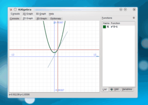 KAlgebra is a mathematical graph calculator included in the KDE education package. While it is based on the MathML content markup language, knowledge of MathML is not required for use. The calculator includes numerical, logical, symbolic, and analytical functions, and can plot the results onto a 2D or 3D graph. KAlgebra is free and open source software, licensed under the GNU Public License.
