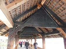 The bridge itself was originally built in 1333 as part of Lucerne's fortifications. It linked the old town on the right bank of the Reuss to the new town on the left bank, securing the city from attack from the south (i.e. from the lake).[7] The bridge initially had a length of over 200 metres (660 ft), although due to numerous shortenings throughout the years and river bank replenishments, the bridge now totals only 170 metres (560 ft) in length.[6] It is the oldest surviving truss bridge in the world, consisting of strutted and triangulated trusses of moderate span, supported on piled trestles; as such, it is probably an evolution of the strutted bridge.[3]
