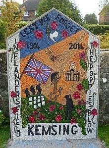 Kemsing is a village and civil parish in the Sevenoaks District of Kent, England. The parish is twinned with Compton and lies on the scarp face of the North Downs, 20 miles south east of Central London, 4 miles (6 km) north east of Sevenoaks. Also in the parish are the hamlets of Heaverham, 1 mile (2 km) to the east, and Noah's Ark 0.5 miles (1 km) to the south. The population of the civil parish in 2001 was 4014 persons, increasing to a population of 4,218 at the 2011 Census.[2]
