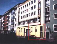 Kling Klang (an onomatopœia; in English: ding dong) began as a studio in 1970; the band marked this as the real beginning of Kraftwerk.[1] The studio began as an empty room in a workshop premises located in an industrial part of Düsseldorf.[1] The building exterior was clad in yellow tiles with a large electric shuttered doorway leading to an enclosed courtyard. On the right was a loading stage used by an electrical installation company that used the upper floor.[2] The studio was accessed through a small anteroom. The main studio room was fitted with sound insulation and measured about sixty square feet. Later on other adjoining rooms were used for things like making instruments such as home made oscillators.[1] The basement of the studio was used to store old instruments and machines. The band never threw anything away, and subsequently used the older equipment to recreate sounds.[3]