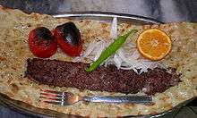 Ground lamb or beef, seasoned and grilled on a skewer, often served wrapped in lavash and topped with tomato sauce and yogurt, traced back to the famous kebab house Beyti in Istanbul and particularly popular in Turkey's larger cities.[13] |