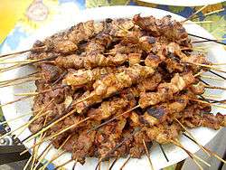 This is a list of kebab variants from around the world. Kebab is a dish of pieces of meat, fish, or vegetables roasted or grilled on a skewer or spit.[1] The dish originated in the Middle East,[2][3] before spreading worldwide.