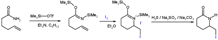 - In iodolactamization [1] an iminium ion reacts with an halonium ion formed in situ by reaction of an alkene with iodine.