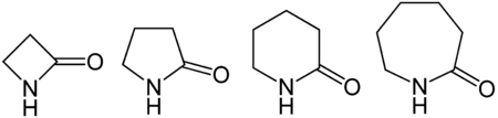 From left to right, general structures of a β-lactam, a γ-lactam, a δ-lactam, and an ε-lactam. The specific structures are β-propiolactam, γ-butyrolactam, δ-valerolactam, and ε-caprolactam.