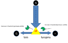 In cells with sufficient nutrients, protease activity is high, which breaks down cII.[17] This leads to the lytic lifestyle. In cells with limited nutrients, protease activity is low, making cII stable. This leads to the lysogenic lifestyle. cIII appears to stabilize cII, both directly and by acting as a competitive inhibitor to the relevant proteases. This means that a cell "in trouble", i.e. lacking in nutrients and in a more dormant state, is more likely to lysogenise. This would be selected for because the phage can now lie dormant in the bacterium until it falls on better times, and so the phage can create more copies of itself with the additional resources available and with the more likely proximity of further infectable cells.
