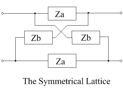 Lattice delay networks are an important subgroup of lattice networks. They are all-pass filters, so they have a flat amplitude response, but a phase response which varies linearly (or almost linearly) with frequency. All lattice circuits, regardless of their complexity, are based on the schematic shown below, which contains two series impedances, Za, and two shunt impedances, Zb. Although there is duplication of impedances in this arrangement, it offers great flexibility to the circuit designer so that, in addition to its use as delay network (as featured here) it can be configured to be a phase corrector,[1] a dispersive network,[2] an amplitude equalizer,[3] or a low pass (or bandpass) filter,[4] according to the choice of components for the lattice elements .