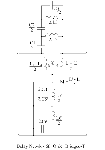 An exact solution requires an infinite number of terms, but an nth order approximation is obtained by terminating za after n elements. (If the last component retained is a capacitor, the remainder of the network is replaced by a short circuit). So, for example, terminating this expression after six terms will give a sixth order delay, which can be synthesised directly by Cauer’s methods[4][11] to give the network shown.