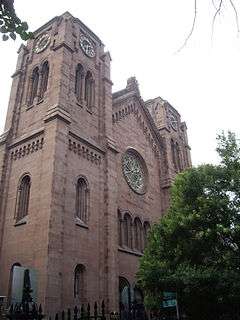- ↑ Removal of the Gothic stone spires (1889) leaves the church more decidedly Romanesque; Romanesque was still an unfamiliar architectural vocabulary; the design was described as being in the "Byzantine or Early Christian style of architecture." (Kathleen Curran, "19th Century AD", The Art Bulletin December 1999 on-line text).