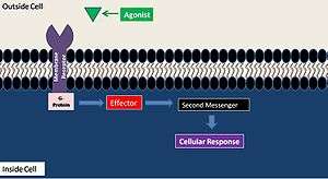 S1P is probably formed at the inner leaflet of the plasma membrane in response to TNFα and other receptor activity-altering compounds called agonists.[36][37] S1P, being present in low nanomolar concentrations in the cell, has to interact with high-affinity receptors that are capable of sensing their low levels. So far, the only identified receptors for S1P are the high-affinity G protein-coupled receptors (GPCRs), also known as S1P receptors (S1PRs). S1P is required to reach the extracellular side (outer leaflet) of the plasma membrane to interact with S1PRs and launch typical GPCR signaling pathways.[38][39] However, the zwitterionic headgroup of S1P makes it unlikely to flip-flop spontaneously. To overcome this difficulty, the ATP-binding cassette (ABC) transporter C1 (ABCC1) serves as the "exit door" for S1P.[40] On the other hand, the cystic fibrosis transmembrane regulator (CFTR) serves as the means of entry for S1P into the cell.[41] In contrast to its low intracellular concentration, S1P is found in high nanomolar concentrations in serum where it is bound to albumin and lipoproteins.[42] Inside the cell, S1P can induce calcium release independent of the S1PRs—the mechanism of which remains unknown. To date, the intracellular molecular targets for S1P are still unidentified.[31]