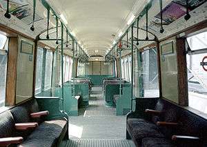 Although visually similar to the R Stock trains there were some differences from the O, P and Q Stock trains. These included external 'door open' indicator lights,[5] roller destination blinds,[6] fluorescent lighting[5] and a modified way of displaying the internal advertisements and District line route maps. One of the most noticeable differences between the R38 Stock and the rest of the R Stock fleet was that the R38 cars featured four small windows in the central saloon between the double doors, whereas the R47, R49, and R59 cars featured just two larger windows in the same location. All R Stock cars seated 40 passengers, however whilst the R38 cars featured two sets of transverse seats in the centre bay, the rest of the fleet featured just one set of transverse seats, and more longitudinal seating.