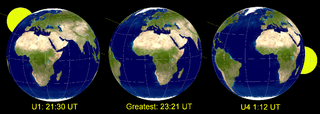 The whole event was visible from Europe, Africa, parts of South America, and some areas of North America, Asia, and Western Australia. In North America, part of the event was visible at moonrise.