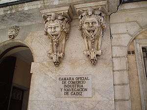 In architecture, a mascaron ornament is a face, usually human, sometimes frightening or chimeric whose function was originally to frighten away evil spirits so that they would not enter the building.[1] The concept was subsequently adapted to become a purely decorative element. The most recent architectural style to extensively employ mascarons was Beaux Arts.[2][3]